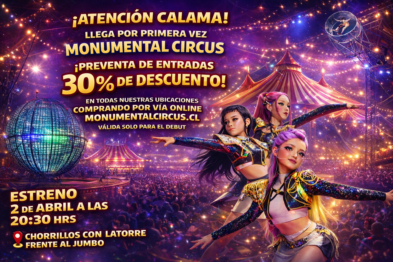 🔥✨ ¡ATENCIÓN CALAMA! ✨🔥El espectáculo más impactante vuelve a Calama🤩🎪💥 Monumental Circus presenta a las GUERRERAS K-POP 💥🎉 Jueves 2 de Abril🕣 Gran debut 20:30 horas📍 Ubicación: Chorrillos con La Torre, frente al JumboVive una noche llena de luces, música, adrenalina y un show que te dejará sin aliento 🔥✨🎟 Compra tus entradas en boleterías del circo o en🌐 monumentalcircus.cl¡No te lo puedes perder! 💜🎪